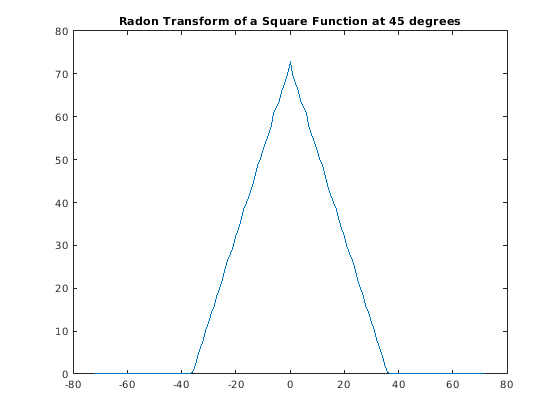 В этом примере показано, как вычислить преобразование Радона изображения, I, для определенного набора углов, theta, использование radon функция. Функция возвращается, R, в котором столбцы содержат Радон, преобразовывают для каждого угла в theta. Функция также возвращает вектор, xp , который содержит соответствующие координаты вдоль оси X. Центральный пиксель I задан, чтобы быть floor((size(I)+1)/2), который является пикселем на оси X, соответствующей x' = 0.