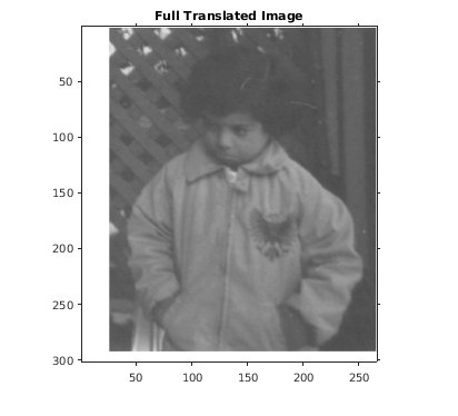 Когда 'OutputView' 'full' и translation дробное количество пикселей, imtranslate расширяет мировые пределы выхода пространственный объект привязки к самому близкому шагу полного пикселя. imtranslate делает это так, чтобы это содержало обоих исходные и переведенные изображения в том же разрешении как входное изображение. Дополнительная степень изображений в каждом добавляется на одной стороне изображения в направлении, которое указывает вектор сдвига. Например, когда translation дробно и положителен и в X и в Y, затем imtranslate расширяет максимум XWorldLimits и YWorldLimits заключать 'full' ограничительный прямоугольник в разрешении входного изображения.