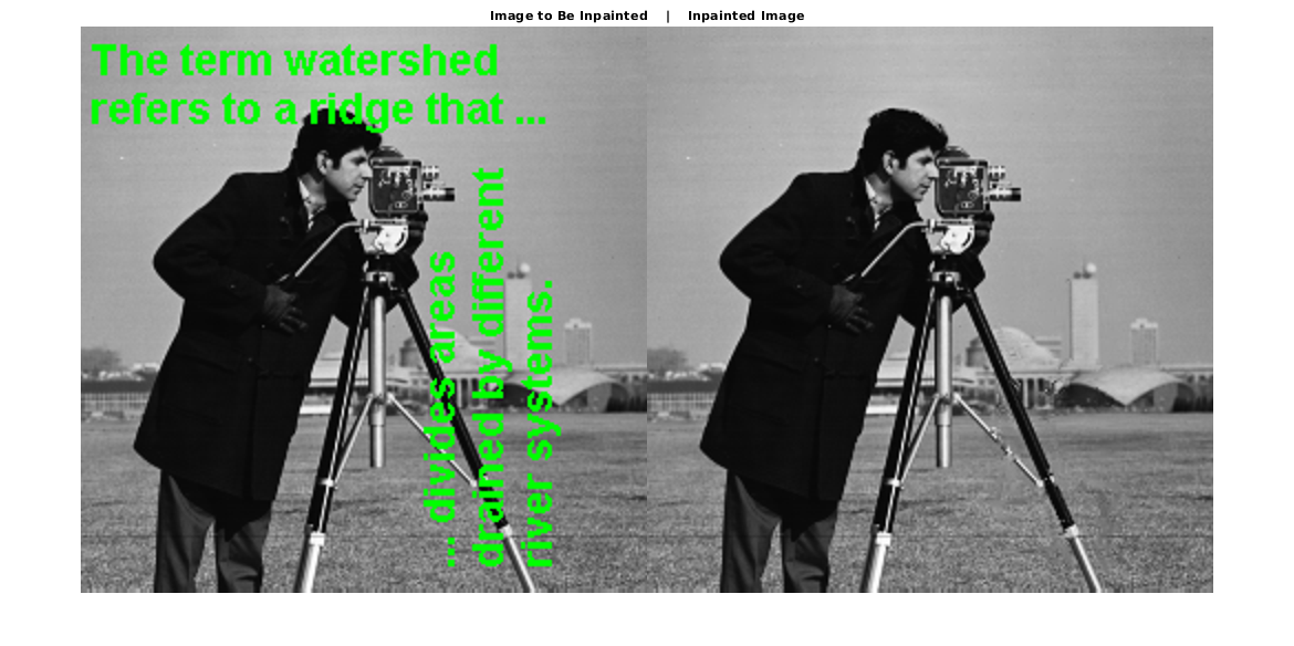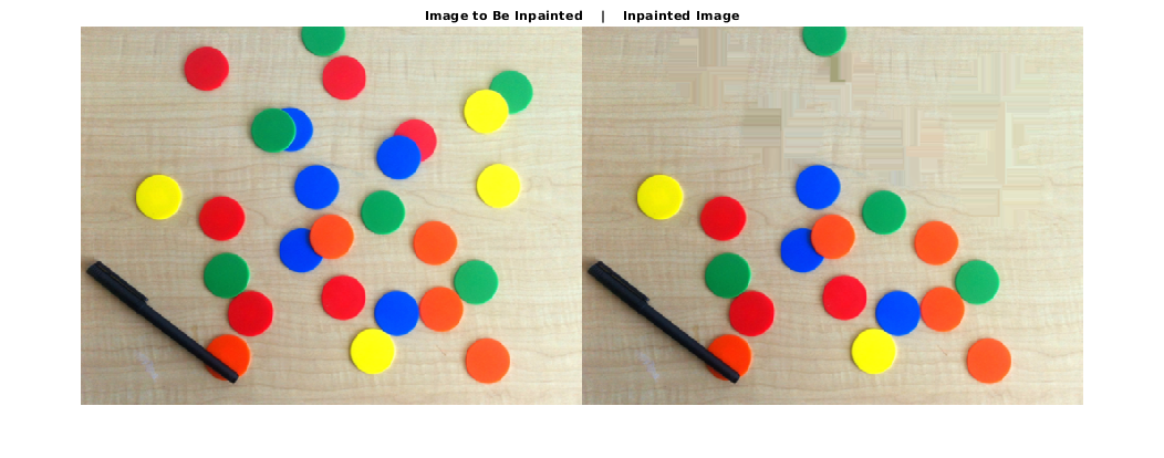 Результаты inpainting зависят от спецификации пары "имя-значение". Можно изменить значения 'Radius' и 'SmoothingFactor' для варьировавшихся результатов.