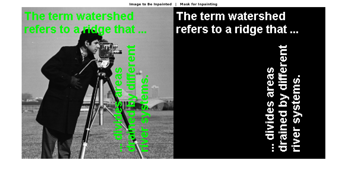 Идентифицируйте целевые области от входного изображения, чтобы быть заполненными или inpainted. Сгенерируйте бинарную маску размера то же самое как входное изображение. Ненулевые пиксели в рисунке маски должны содержать целевые области, чтобы быть inpainted.