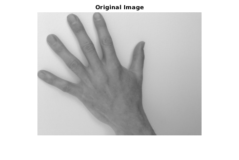 A = imread('hands1.jpg'); I = rgb2gray(A); figure imshow(I) title('Original Image')