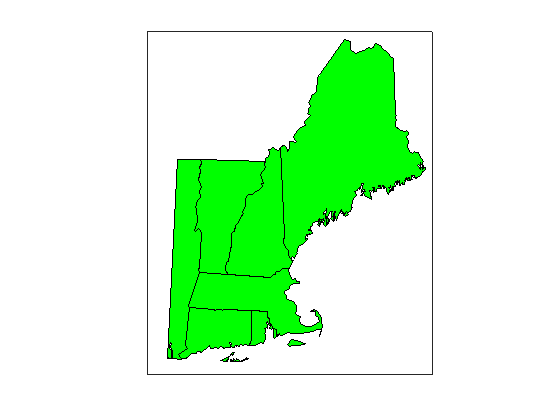 axesm('MapProjection', 'eqaconic', 'MapParallels', [],... 'MapLatLimit', MapLatLimit, 'MapLonLimit', MapLonLimit,... 'GLineStyle', '-') geoshow(NEstates, 'DisplayType', 'polygon', 'FaceColor','green')