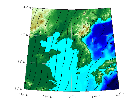 contourm(lat,lon,Z) отображает контурный график определенной геолокацию сетки данных, Z с геолокацией, заданной lat и lon.