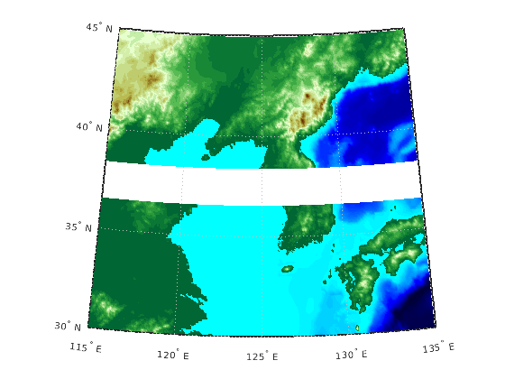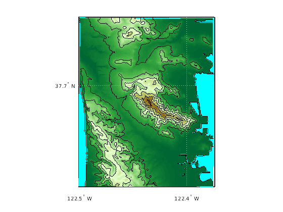 geoshow( проекты и отображения определенная геолокацию сетка данных, lat,lon,Z)Z. В этом синтаксисе, lat и lon массивы долготы широты M на n. Z массив M на n класса double. Можно опционально отобразить данные как поверхность, mesh, текстурную карту, или очертить при помощи DisplayType аргумент пары "имя-значение".