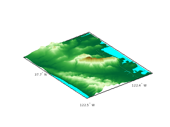 geoshow( проекты и отображения обычная сетка данных, Z,R)Z, с объектом привязки R. Можно опционально отобразить данные как поверхность, mesh, текстурную карту, или очертить при помощи DisplayType аргумент пары "имя-значение". Если DisplayType 'texturemap', затем geoshow создает поверхность с ZData набор значений к 0.