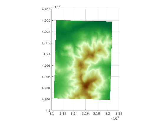 mapshow( отображает обычную сетку данных, Z,R)Z, с объектом привязки R. Можно опционально отобразить данные как поверхность, mesh, текстурную карту, или очертить при помощи DisplayType аргумент пары "имя-значение". Если DisplayType 'texturemap', затем mapshow отображает изображение как texturemap на поверхности нулевого вертикального изменения (установкой ZData значения к 0).