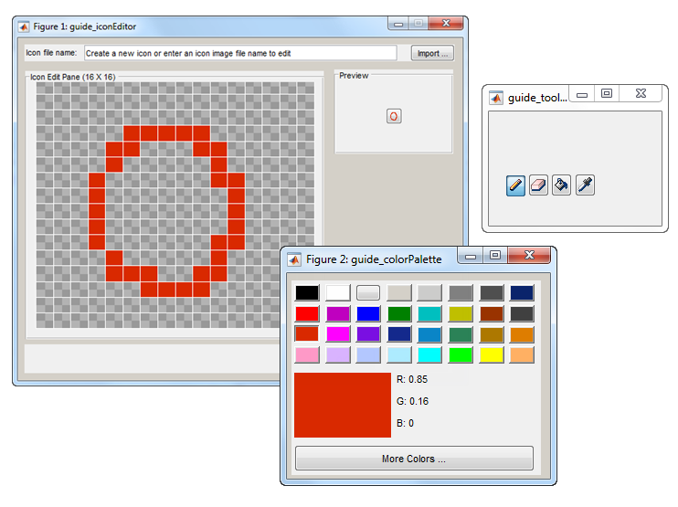 Вот предварительно созданное приложение GUIDE, которое использует guidata и UserData осуществлять обмен данными среди трех окон приложения. Большое окно является редактором иконок, который принимает информацию из окон палитры инструментов и цветовой палитры.