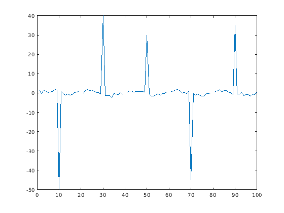 x = 1:100; data = cos(2*pi*0.05*x+2*pi*rand) + 0.5*randn(1,100); data(20:20:80) = NaN; data(10:20:90) = [-50 40 30 -45 35]; plot(x,data)