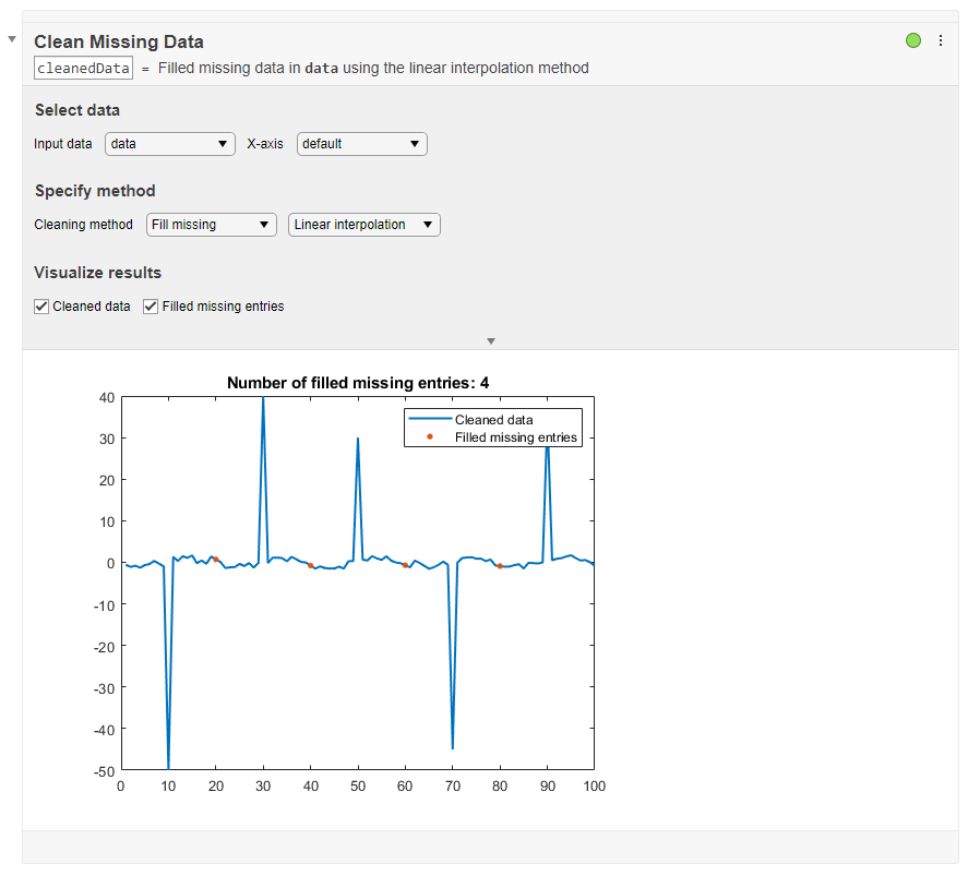 Заменять NaN значения в данных и визуализируют результаты, открывают Чистую Недостающую задачу Данных. Запустите путем ввода ключевого слова missing в блоке кода, и затем нажимают Clean Missing Data когда это появляется в меню. Выберите входные данные и метод очистки, чтобы отобразить заполненные данные на графике автоматически.