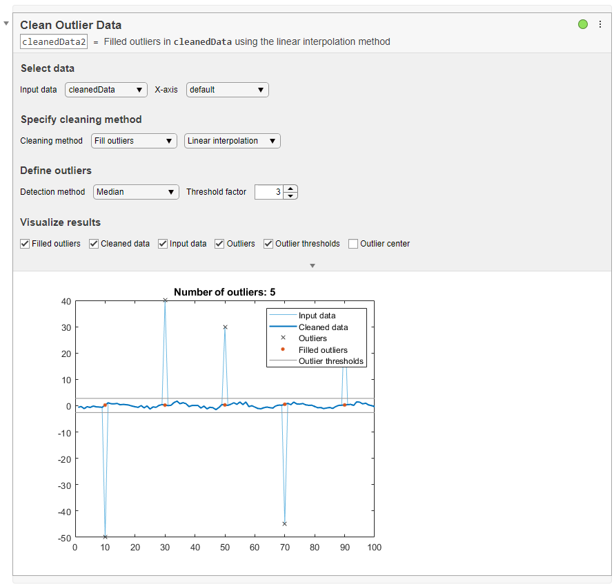 Можно теперь удалить выбросы из убранных данных в предыдущей задаче при помощи Чистой задачи Данных о Выбросе. Введите ключевое слово outliers в новом коде блокируют и нажимают Clean Outlier Data открыть задачу. Выберите cleanedData как входные данные. Можно настроить методы для того, чтобы очистить и обнаружить выбросы, и настроить порог, чтобы найти больше или меньше выбросов.