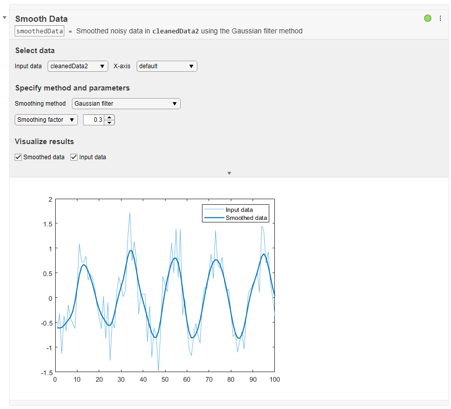 Затем сглаживайте убранные данные из предыдущей задачи при помощи Сглаженной задачи Данных. Введите ключевое слово smooth и кликните по задаче, когда это появится. Выберите cleanedData2, выход от предыдущей задачи, как входные данные. Выберите метод сглаживания и настройте фактор сглаживания для того, чтобы более или менее сглаживать.