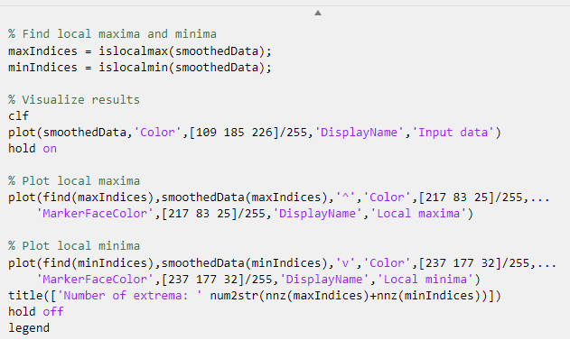 Наконец, начните вводить ключевое слово extrema и нажмите Find Local Extrema. Используйте smoothedData как входные данные и изменение экстремальный тип, чтобы найти и локальные максимумы и локальные минимумы убранных, сглаживавших данных. Можно настроить параметры локальных экстремальных значений, чтобы найти больше или меньше максимумов и минимумов.