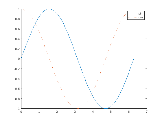 x = 0:pi/100:2*pi; y = sin(x); plot(x,y) hold on y2 = cos(x); plot(x,y2,':') legend('sin','cos') hold off