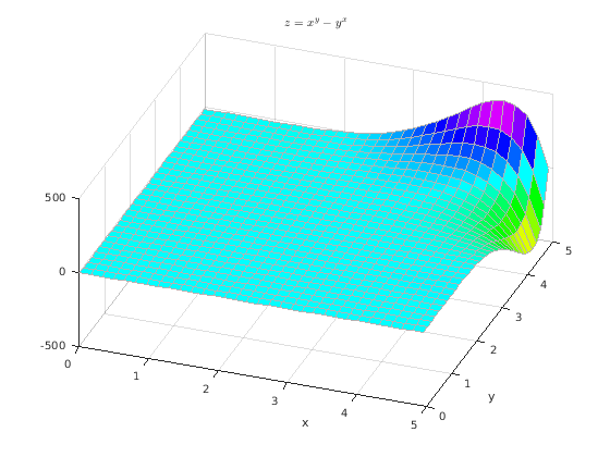 % Define the mesh x = 0:0.16:5; y = 0:0.16:5; [xx,yy] = meshgrid(x,y); % The plot zz = xx.^yy-yy.^xx; h = surf(x,y,zz); h.EdgeColor = [0.7 0.7 0.7]; view(20,50); colormap(hsv); title('$z = x^y-y^x$','Interpreter','latex') xlabel('x') ylabel('y') hold on