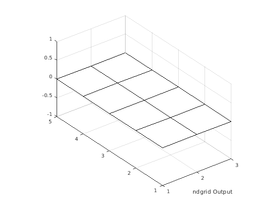figure() [X1_ndgrid,X2_ndgrid] = ndgrid(1:3,1:5); Z = zeros(3,5); mesh(X1_ndgrid,X2_ndgrid,Z,'EdgeColor','black') axis equal; % Set the axis labeling and title h1 = gca; h1.XTick = [1 2 3]; h1.YTick = [1 2 3 4 5]; xlabel('ndgrid Output')