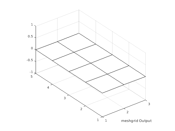 figure() [X_meshgrid,Y_meshgrid] = meshgrid(1:3, 1:5); mesh(X_meshgrid,Y_meshgrid,Z','EdgeColor','black') axis equal; % Set the axis labeling and title h2 = gca; h2.XTick = [1 2 3]; h2.YTick = [1 2 3 4 5]; xlabel('meshgrid Output')