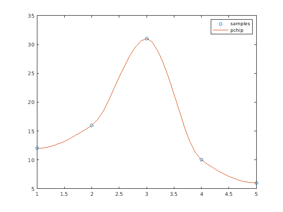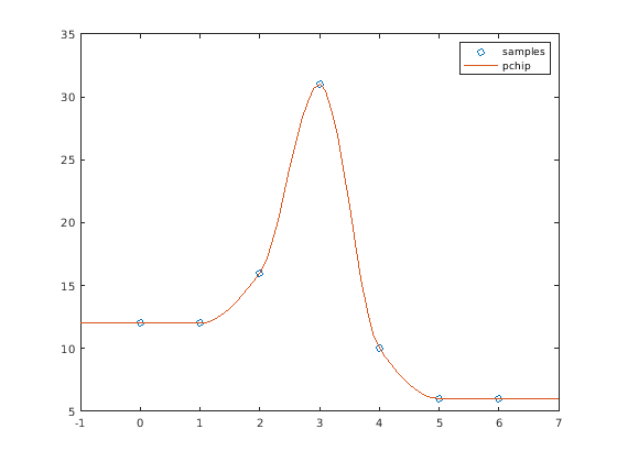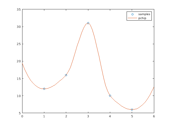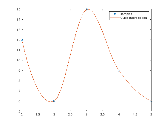 plot(X,V,'o'); hold on plot(Xq,Vq,'-'); legend('samples','Cubic Interpolation');