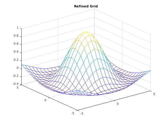 F = griddedInterpolant(X,Y,Z,V,'cubic');Поскольку мы уже создали полную сетку, чтобы сгенерировать наши демонстрационные значения, нам была нечего терять мимоходом она к griddedInterpolant. На практике однако распространено загрузить выборочные данные в MATLAB от диска. Компактная сетка может очень выгодный в таких случаях, потому что она позволяет вам задавать целую сетку в форме, которая намного более экономична в терминах памяти. Если мы загрузили V в MATLAB вместо того, чтобы вычислить его от полной сетки, мы, возможно, создали компактную сетку, чтобы сохранить память в нашей рабочей области. Например,