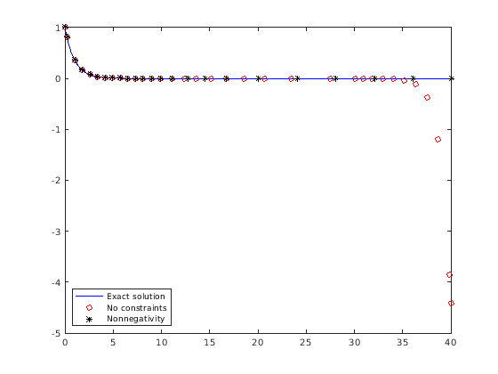 legend('Exact solution','No constraints','Nonnegativity', ...