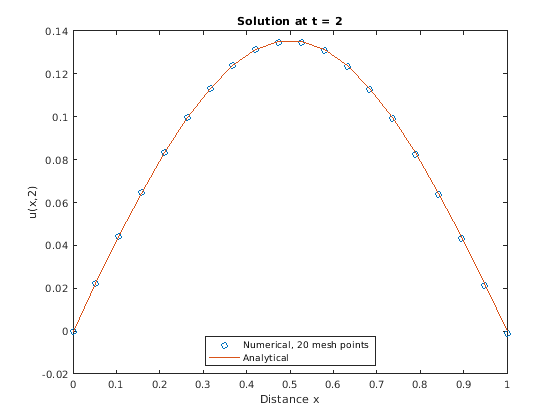 plot(x,u(end,:),'o',x,exp(-t(end))*sin(pi*x)) title('Solution at t = 2') legend('Numerical, 20 mesh points','Analytical','Location','South') xlabel('Distance x') ylabel('u(x,2)')