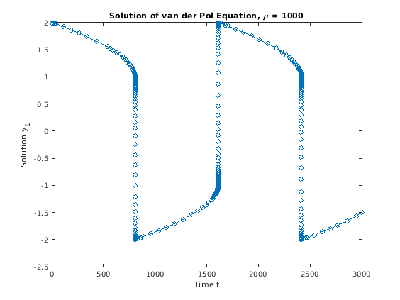 [t,y] = ode15s(@vdp1000,[0 3000],[2; 0]); plot(t,y(:,1),'-o'); title('Solution of van der Pol Equation, \mu = 1000'); xlabel('Time t'); ylabel('Solution y_1');