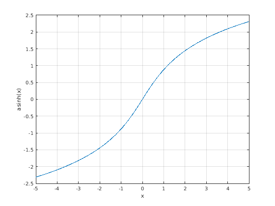 x = -5:.01:5; plot(x,asinh(x)) grid on xlabel('x') ylabel('asinh(x)')