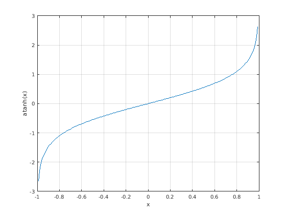 x = -0.99:0.01:0.99; plot(x,atanh(x)) grid on xlabel('x') ylabel('atanh(x)')