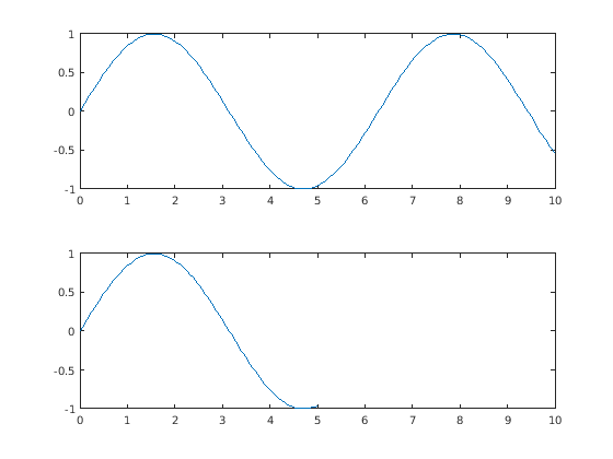 Начиная в R2019b, можно отобразить мозаичное размещение графиков с помощью tiledlayout и nexttile функции. Вызовите tiledlayout функция, чтобы создать 2 1 мозаичное размещение графика. Вызовите nexttile функция, чтобы создать объекты осей ax1 и ax2. Отобразите данные на графике в каждом, исключает. Затем установите пределы по осям для обеих осей к тем же значениям.
