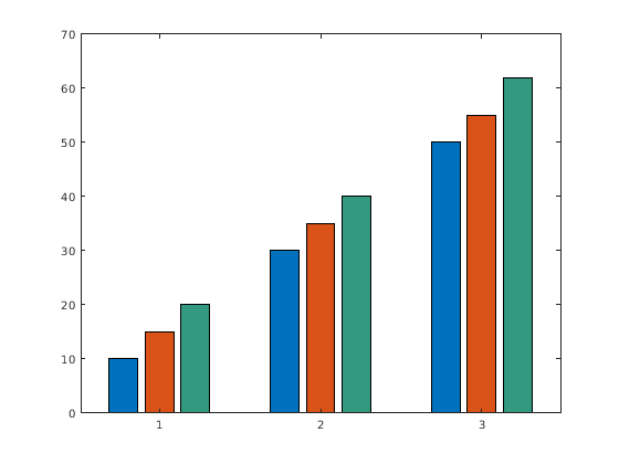 y = [10 15 20; 30 35 40; 50 55 62]; b = bar(y);