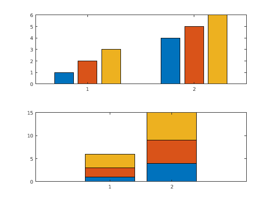 y = [1 2 3; 4 5 6]; tiledlayout(2,1) % Top bar graph ax1 = nexttile; bar(ax1,y) % Bottom bar graph ax2 = nexttile; bar(ax2,y,'stacked')