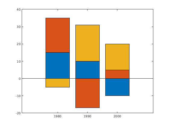 Задайте x как вектор трехлетних значений. Задайте y как матрица, которая содержит комбинацию отрицательных и положительных значений. Отобразите значения в столбчатом графике.