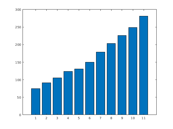 y = [75 91 105 123.5 131 150 179 203 226 249 281.5]; bar(y,0.4)