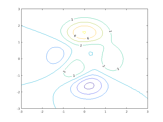 [x,y,z] = peaks; [C,h] = contour(x,y,z); v = [2,6]; clabel(C,h,v)