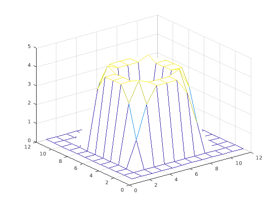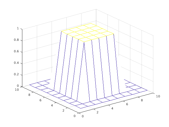 A = zeros(10); A(3:7,3:7) = ones(5); mesh(A)