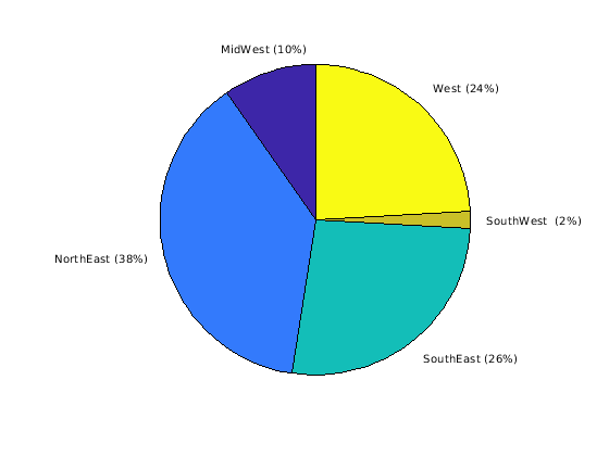 Может быть удобно преобразовать переменные в типы данных, которые предлагают различную функциональность. Например, теперь, когда T2.Region категориальная переменная, можно использовать pie функция, чтобы сделать круговую диаграмму отключений электроэнергии областью. Но вы не можете использовать T1.Region как входной параметр к pie, потому что та переменная содержит текст, не категориальные данные.