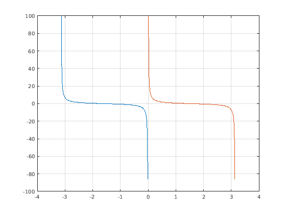 В арифметике с плавающей точкой, cot ограниченная функция. Таким образом, cot не делает возвращаемых значений Inf или -Inf в точках развилки, которые являются множителями pi, но большой номер величины вместо этого. Это происходит от погрешности представления с плавающей точкой π.