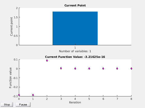 options = optimset('PlotFcns',{@optimplotx,@optimplotfval});Запустите fzero включая options.