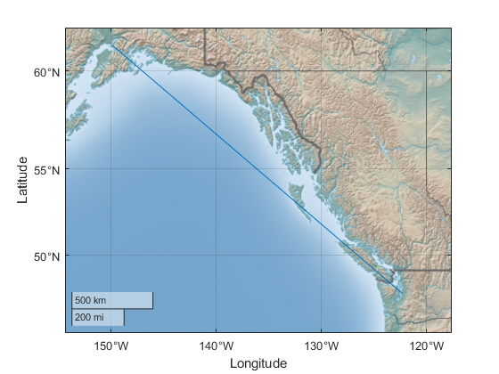 geoplot( строит график в географические оси с вершинами в местоположениях долготы широты, заданных (в градусах) векторами lat,lon)lat и lon. lat и lon входные параметры должны быть одного размера. По умолчанию, geoplot проводит сплошную линию, без маркеров, с помощью цветов, заданных ColorOrder свойство Географического объекта осей.