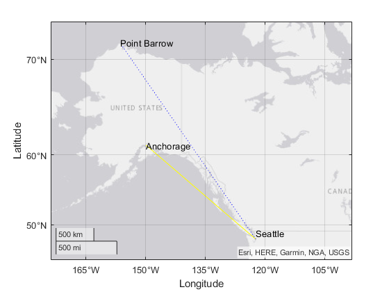 geoplot(lat1,lon1,LineSpec1,...,latN,lonN,LineSpecN) построил графики, заданные несколькими наборами местоположений долготы широты, с отдельным LineSpec для каждой линии.