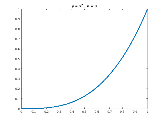 x = 0:0.01:1; n = 3; y = x.^n; plot(x,y,'LineWidth',3) title(['y = x^n, n = ' num2str(n) ])