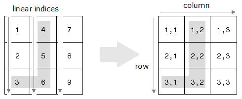 Для массива A, если [I1,…,In] = ind2sub(size(A),ind), затем A(I1(k),…,In(k)) = A(ind(k)) для всего k.