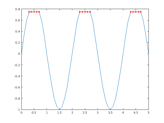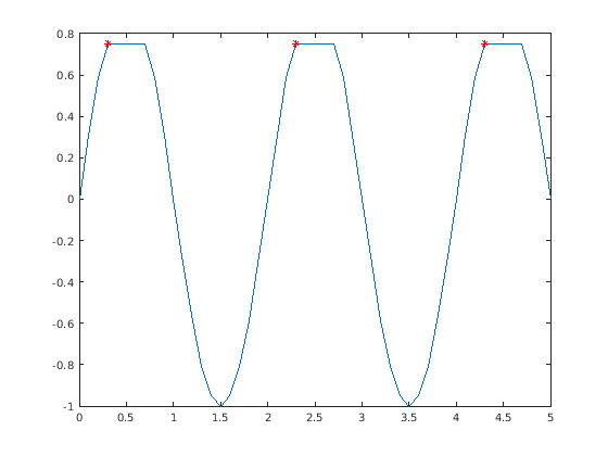 x = 0:0.1:5; A = min(0.75, sin(pi*x)); TF1 = islocalmax(A, 'FlatSelection', 'first'); plot(x,A,x(TF1),A(TF1),'r*')