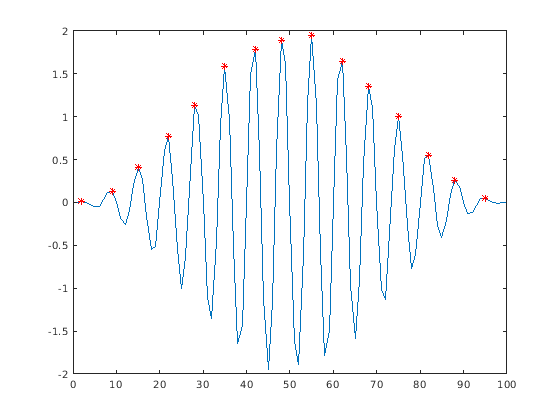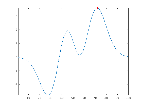 TF2 = islocalmax(A,'MinProminence',2); plot(x,A,x(TF2),A(TF2),'r*') axis tight