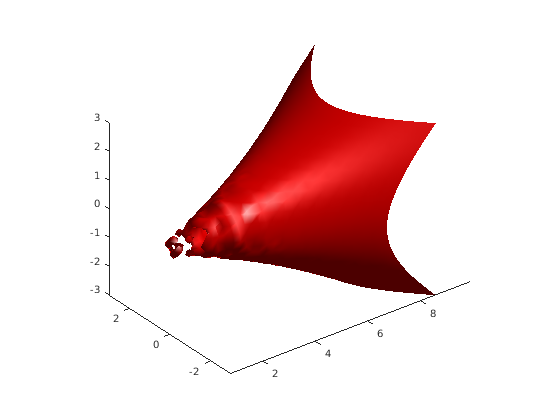 [x,y,z,v] = flow; p = patch(isosurface(x,y,z,v,-3)); isonormals(x,y,z,v,p) p.FaceColor = 'red'; p.EdgeColor = 'none'; daspect([1 1 1]) view(3); axis tight camlight lighting gouraud