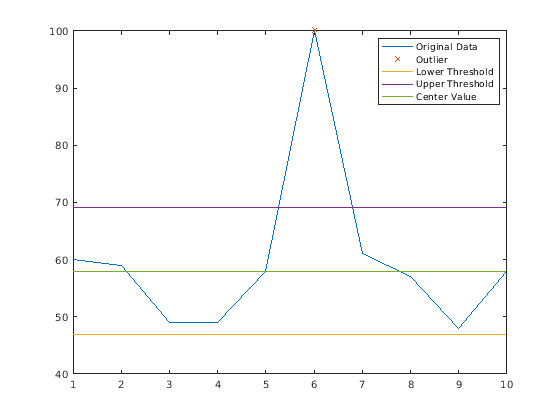 x = 1:10; A = [60 59 49 49 58 100 61 57 48 58]; [TF,L,U,C] = isoutlier(A); plot(x,A,x(TF),A(TF),'x',x,L*ones(1,10),x,U*ones(1,10),x,C*ones(1,10)) legend('Original Data','Outlier','Lower Threshold','Upper Threshold','Center Value')