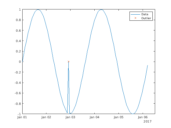 TF = isoutlier(A,'movmedian',hours(5),'SamplePoints',t); plot(t,A,t(TF),A(TF),'x') legend('Data','Outlier')