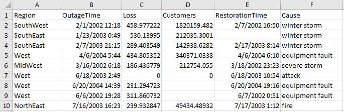 Предварительно просмотрите данные в airlinesmall_subset.xlsx. Заметьте логические данные в столбце Cancelled. Только предварительный просмотр строк 30 - 40 показывают здесь.