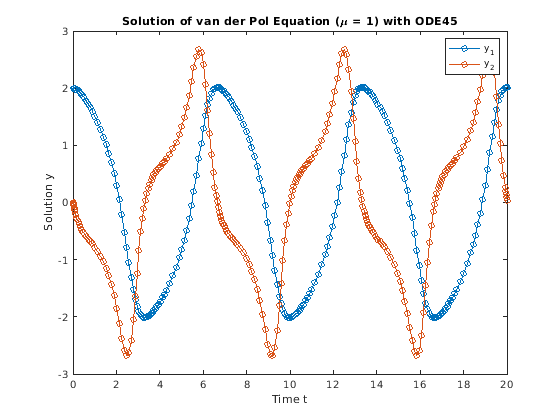 ode45(odefun,tspan,y0)tspan = [t0 tf], интегрирует систему дифференциальных уравнений от t0 к tf с начальными условиями y0. Каждая строка в массиве решения y соответствует значению, возвращенному в вектор-столбце t.
