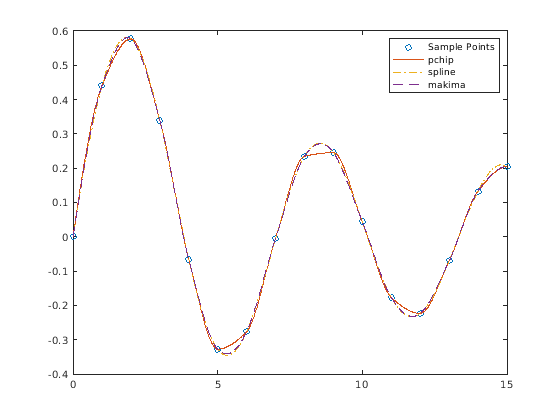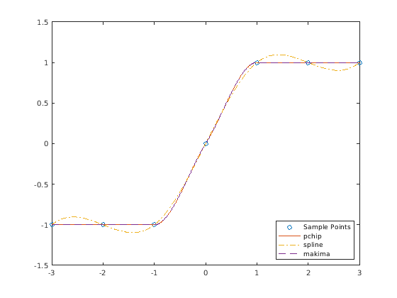 pchip не имеет никаких перерегулирований и меньшего количества колебания, если данные не являются гладкими.