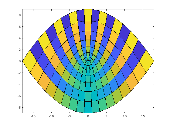 pcolor(X,Y,C) задает x - и y - координирует для вершин. Размер C должен совпадать с размером x-y координатная сетка. Например, если X и Y задайте m-by-n сетка, затем C должен быть m-by-n матрица.